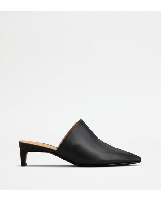 Characterized by a wraparound kitten heel, these mules come with a tapered toe and an elegant front slit. The minimal and elegant line is emphasized by a soft nappa leather with a semi-shiny finishing. Color: black