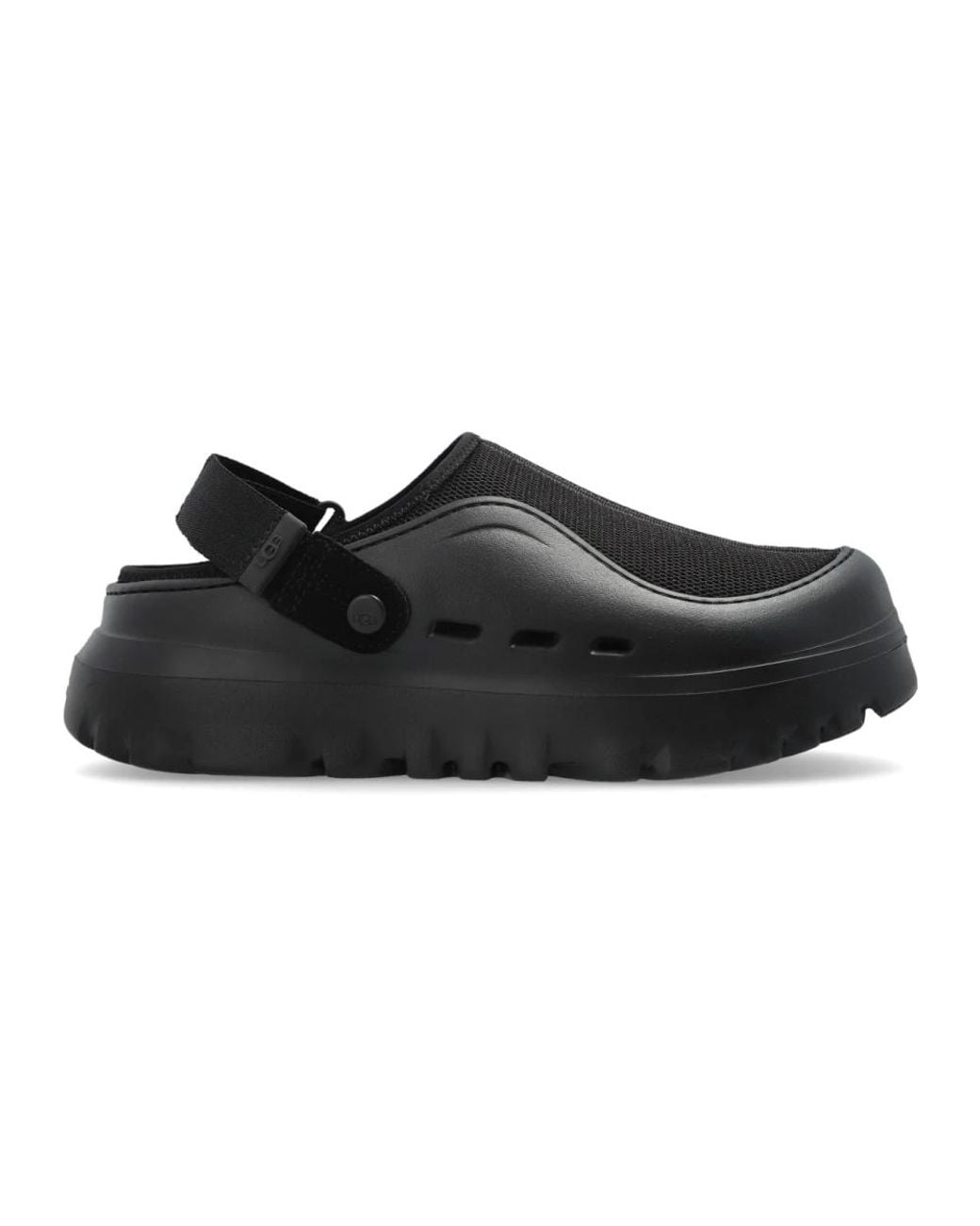 UGG M Peakmod Shoes combine a modern slide silhouette with a breathable mesh upper and an elevated, durable sole for everyday comfort and easy on‑and‑off wear. Key attributes: Black | Synthetic | Breathable mesh | EVA-cushioned footbed | Durable sole | Adjustable heel strap | Side ventilation openings | Slip-on slide construction | Mesh upper | Thick, sturdy sole | Closed front with open heel silhouette | UGG logo on the insole | Dimensions & fit: Sole height (highest point): 6.5 cm | Composition & care: Synthetic | Mesh | EVA