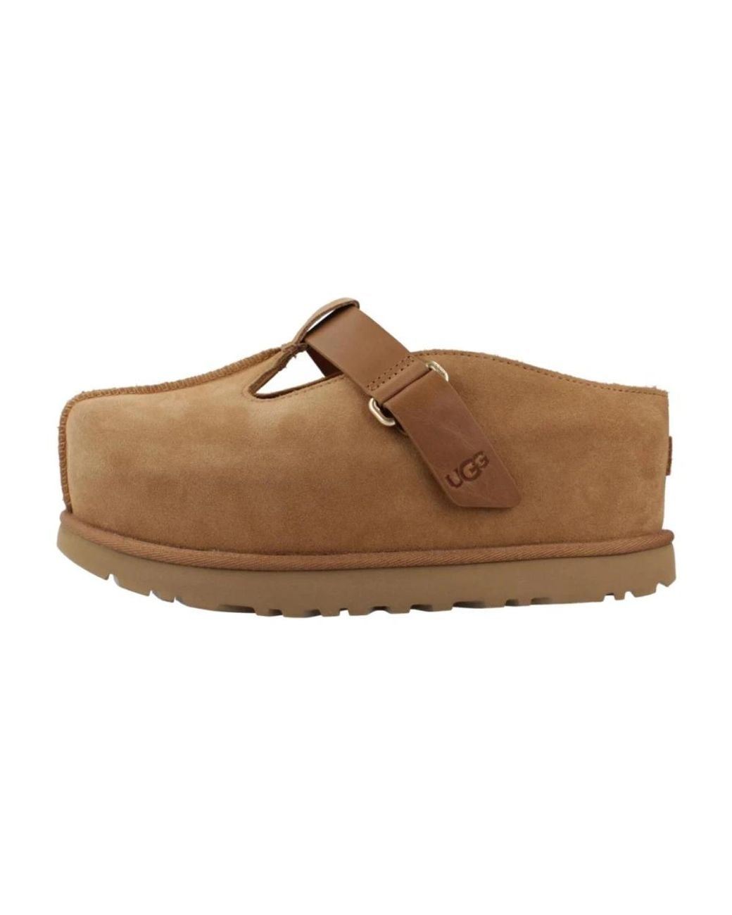 UGG Goldenstar Hi Clog blends a velvety suede upper with a contoured EVA platform to deliver lightweight, all-day comfort and easy everyday styling. Key attributes: Brown | Suede | Lightweight EVA cushioning | Peppermint-based anti-odor sockliner | Grippy EVA outsole | Adjustable leather strap with hook-and-loop closure | Contoured EVA footbed for support | Slip-on clog construction | Platform clog silhouette | Twin seam vamp detail | Overstitched binding | Round toe | Heat‑embossed logo | Composition & care: Suede upper | Leather strap | Textile sockliner | Contoured EVA footbed/midsole/outsole Color: brown