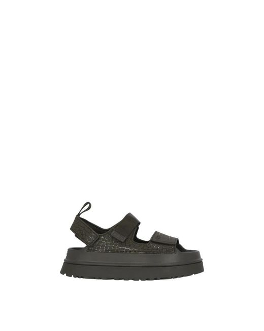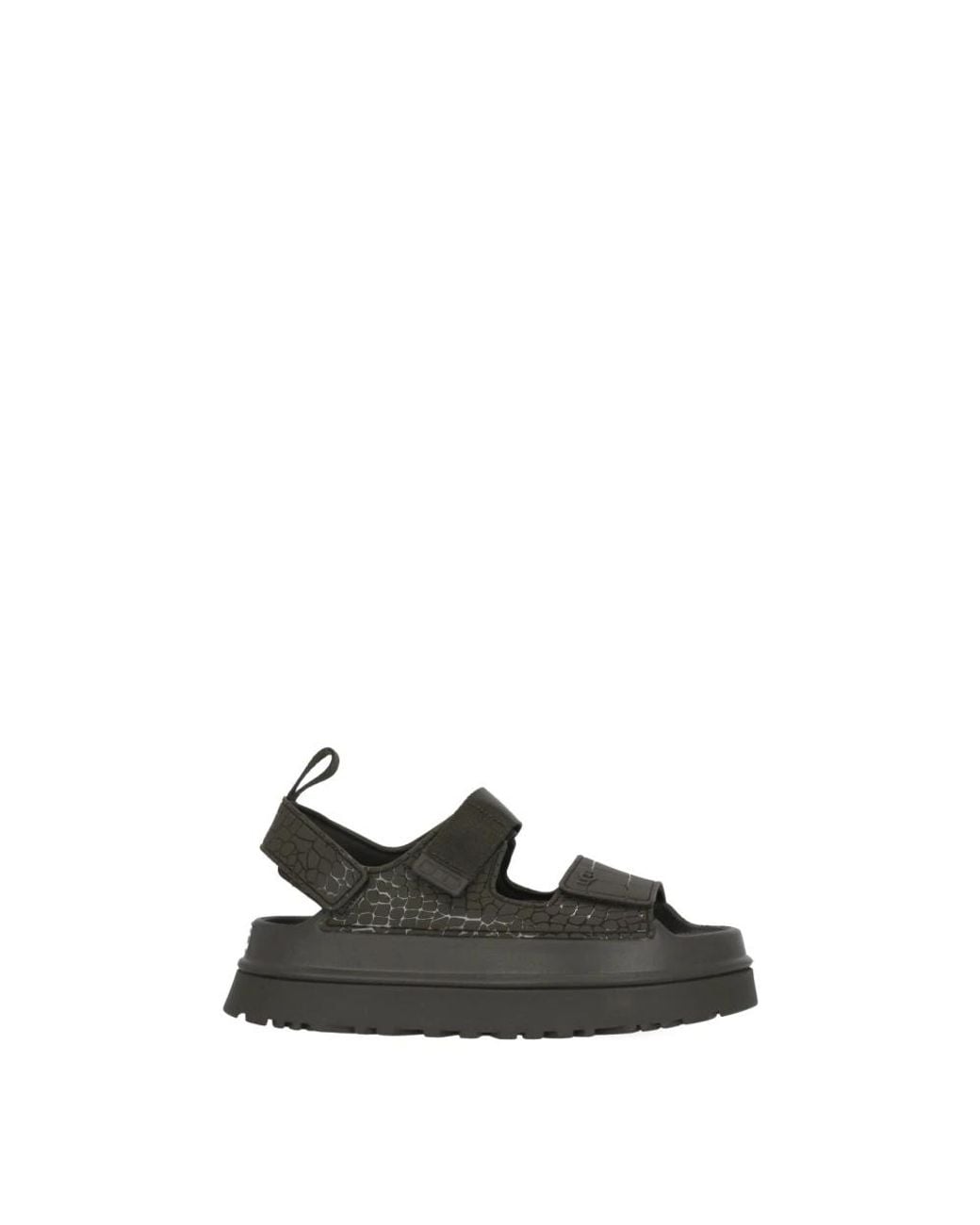 UGG Goldenglow Embossed Sandal combines a crocodile-embossed upper with a chunky platform for everyday style and added height. Model number 1175311; suited for casual wear and city looks. Key attributes: Brown | TPU | Lightweight EVA sole | Front slip with hook-and-loop (velcro) fastening | Rear slip with hook-and-loop (velcro) fastening | Rear pull tab for easy on/off | Round toe | All-over crocodile-embossed pattern | Platform sole (5 cm) | Dimensions & fit: Platform sole: 5 cm | Runs true to size | Composition & care: Upper: TPU | Straps: polyester | Lining: polyester | Midsole: Sugarcane EVA | Outsole: Sugarcane EVA Color: black