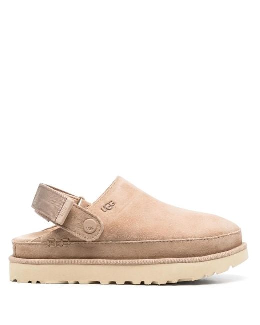 Beige suede debossed logo to the rear debossed logo to the side round toe buckle-fastening slingback strap rear touch-strap fastening branded footbed chunky rubber sole Size: 5. Gender: Female. Material:Fabric/Rubber/Calf Leather.