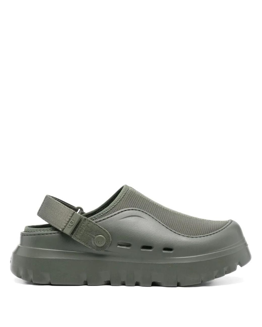 Ugg peakmod clogs green dark green rear touch strap fastening round toe chunky rubber sole fabric polyurethane calf leather rubber flip flops slides shoes menSpecificationValueSeasonSS25Composition"LINING FABRIC 100 OUTER FABRIC 100, POLYURETHANE 100 SOLE CALF LEATHER 100, RUBBER 100"ColorWOODLAND GREENColor CodeWLNMade InVIETNAMISOVNDepartmentMenSectionSHOESSubsectionSANDALSSize InformationSHOES USSize CodeUS Color: gray