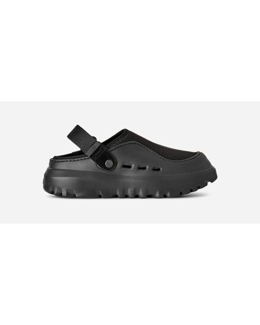 You're going places, and our PeakMod is going with you. Our all-new molded clog is buoyant and born to explore all your best streetwear looks. It's a style-fluid slip-on, a fashion futurist. Express yourself through the sculpted shape and voluminous dimensions while enjoying the elevated feel of the ultra-light sugarcane EVA outsole and the recycled textile sockliner. Designed to adapt, our PeakMod features an adjustable (and removable!) back strap that can be folded to the front and a mesh upper for seamless breathability. | Mesh made with 80% Recycled Polyester, 20% Polyester upper. Removable heel strap. The upper lining textile is made with 100% recycled polyester fibers. Sockliner textile made with 100% recycled polyester. Poured PU footbed incorporates at least 50% bio-based content. Sugarcane EVA midsole. Flocked outsole. Polyester binding. The UGG® Logo screen printed on footbed, Molded rivet with The UGG® Logo. RN 88276. | UGG® Men's PeakMod Textile Shoes in Black, Size 7 Color: black