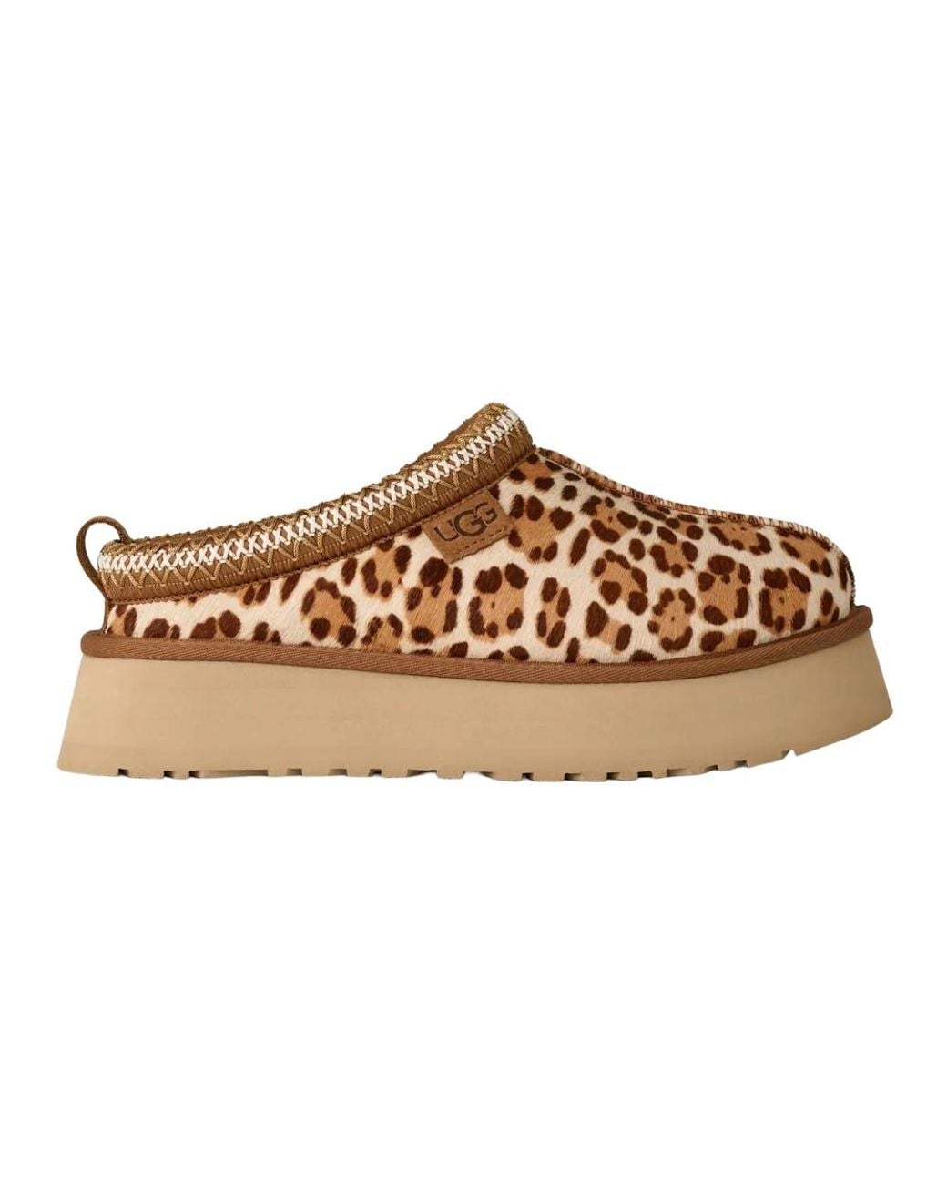 UGG Tazz Plains Slipper combines a braided cavallino upper with a 10 mm UGGplush™ lining for plush indoor comfort and easy on/off wear. The lightweight EVA platform adds cushioning and a subtle lift. Key attributes: Multicolor | Felicity Leopard Jasmine | Polyester | Cushioned EVA midsole | Lightweight EVA outsole | 10 mm UGGplush™ lining and insole | Rear pull tab for easy on/off | UGGbraid braided trim | Cavallino (pony-hair) textured upper | Platform profile | Dimensions & fit: Platform height: 4.4 cm | Composition & care: Upper: UGGbraid made with polyester fibers (100%) | Lining: UGGplush™ (10 mm) — regenerated wool (60%) and Lyocell Tencel™ (40%) | Insole: UGGplush™ (10 mm) — regenerated wool (60%) and Lyocell Tencel™ (40%) | Midsole: EVA | Outsole: EVA made from sugarcane | Trim: Fabric made with polyester fibers (100%) Color: brown