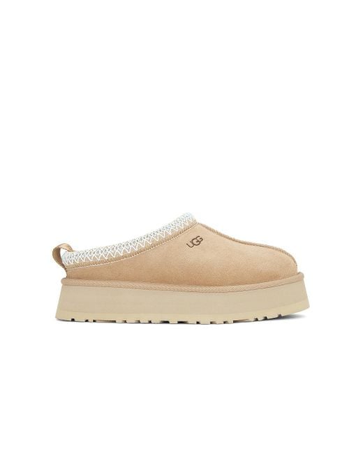 UGG Tazz II Slipper in Tan Suede upper with EVA sole. Made in Vietnam. Slip-on styling. UGGplush ™ 80% upcycled wool, 20% TENCEL ™ Lyocell footbed and lining. Back pull-tab. Embossed UGG logo at side. Approx 40mm/ 1.5 inch platform. UGGF-WZ41. 1174471. About the designer: Color: natural