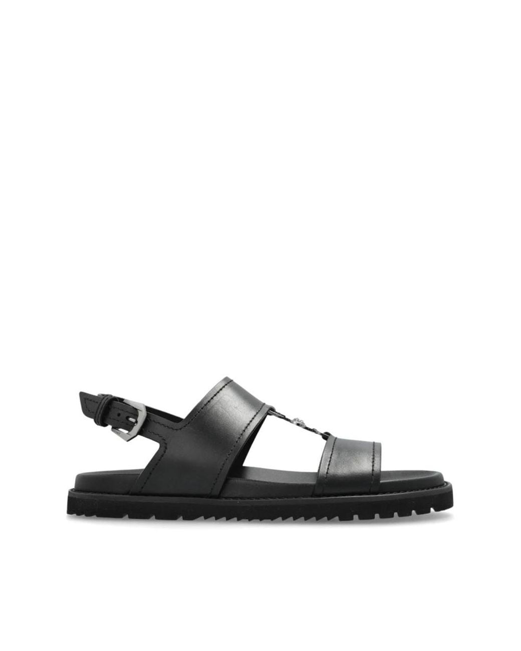 Versace black buckle-fastening ankle strap flat sandals for men with rubber sole, moulded footbed, and branded leather insole.