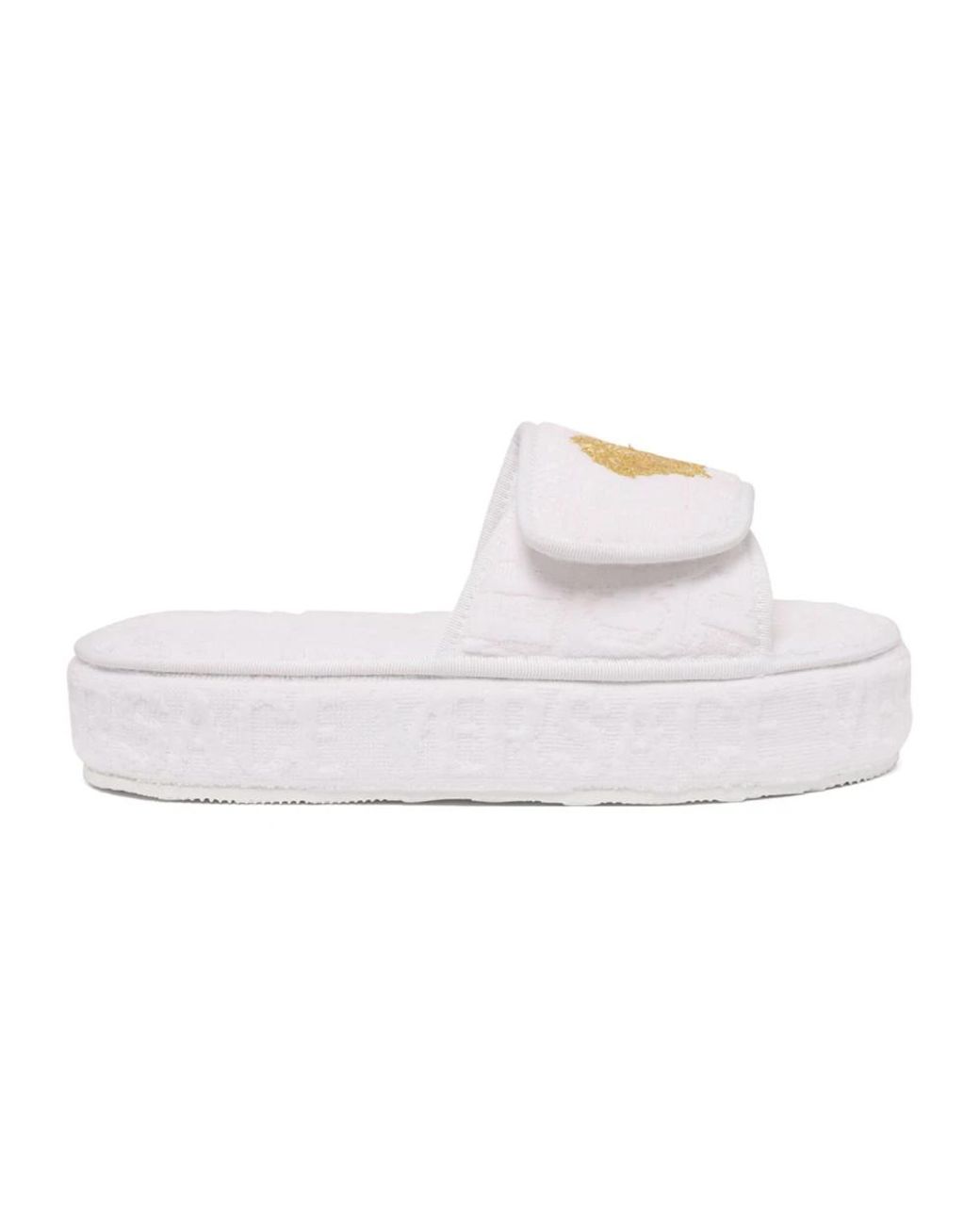 Elevate your style with these Versace Home White Medusa Head Platform Slippers. Featuring a Medusa Head motif and all-over embossed logo print, these white platform slippers are perfect for the fashion-forward woman. With an open toe, front touch-strap fastening, and platform sole, these sliders are both stylish and comfortable. Color: white