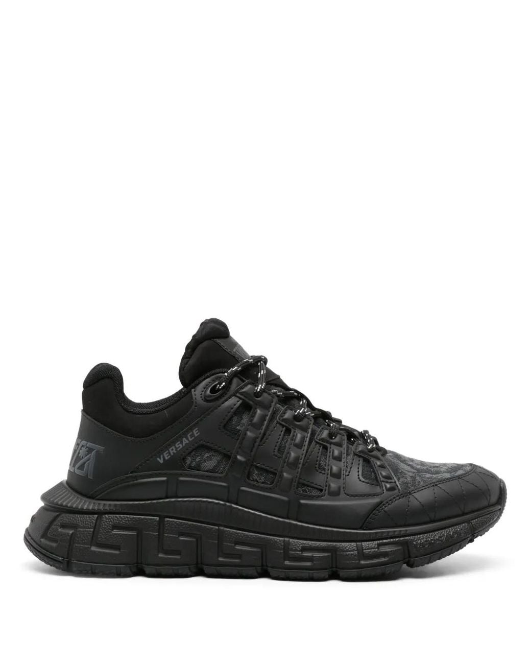 Black canvas/leather caged design signature Barocco print signature Greca detailing Milan coordinates print to the side logo-print strap logo patch at the tongue contrasting branded heel counter logo at the sole decorative stitching round toe lace-up fastening padded ankle mesh lining branded insole chunky rubber sole Size: 38. Gender: Male. Material:Polyurethane/Rubber/Calf Leather/Fabric/Fabric.