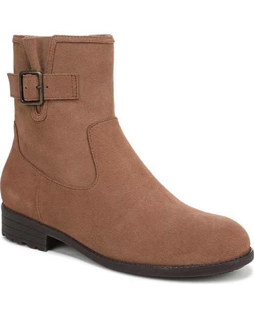 A buckled tab on the shaft adds moto-inspired edge to this bootie that's made from all-day support and comfort with shock-absorbing cushioning and a deep heel cup to provide stability. 1" heel 5 3/4" shaft Side zip closure Vio Motion™ Technology footbed with contoured arch support Leather upper/synthetic lining and sole Imported