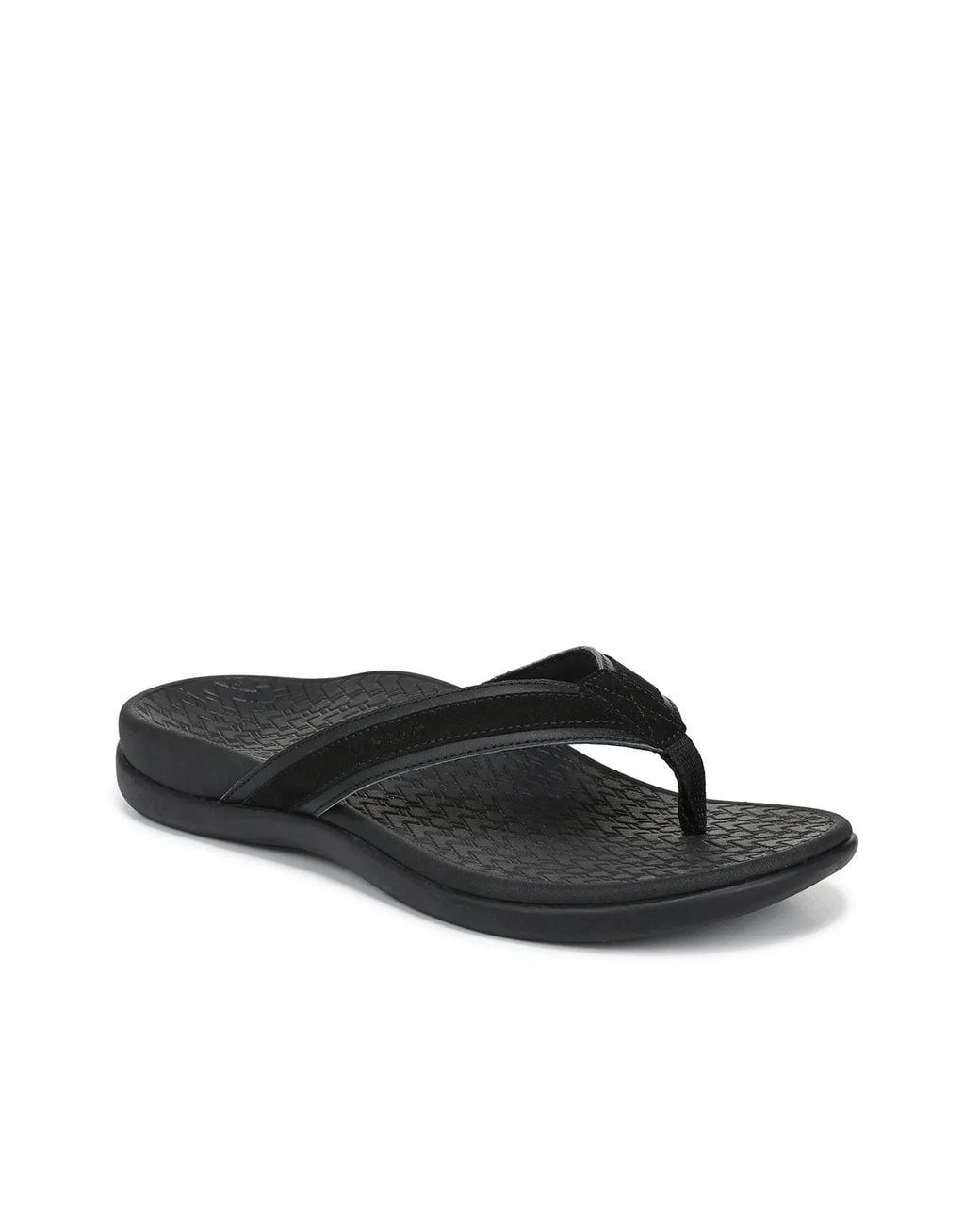Slip into relaxed style and ultimate comfort with the Tide sandal from Vionic. This thong sandal boasts upper crafted from LWG Gold-rated leather for a sustainable approach and durability. Vio-Motion technology featuring contoured arch support, shock-absorbing cushioning, and deep heel cup, provides excellent stability and forefoot flexibility. Color: black