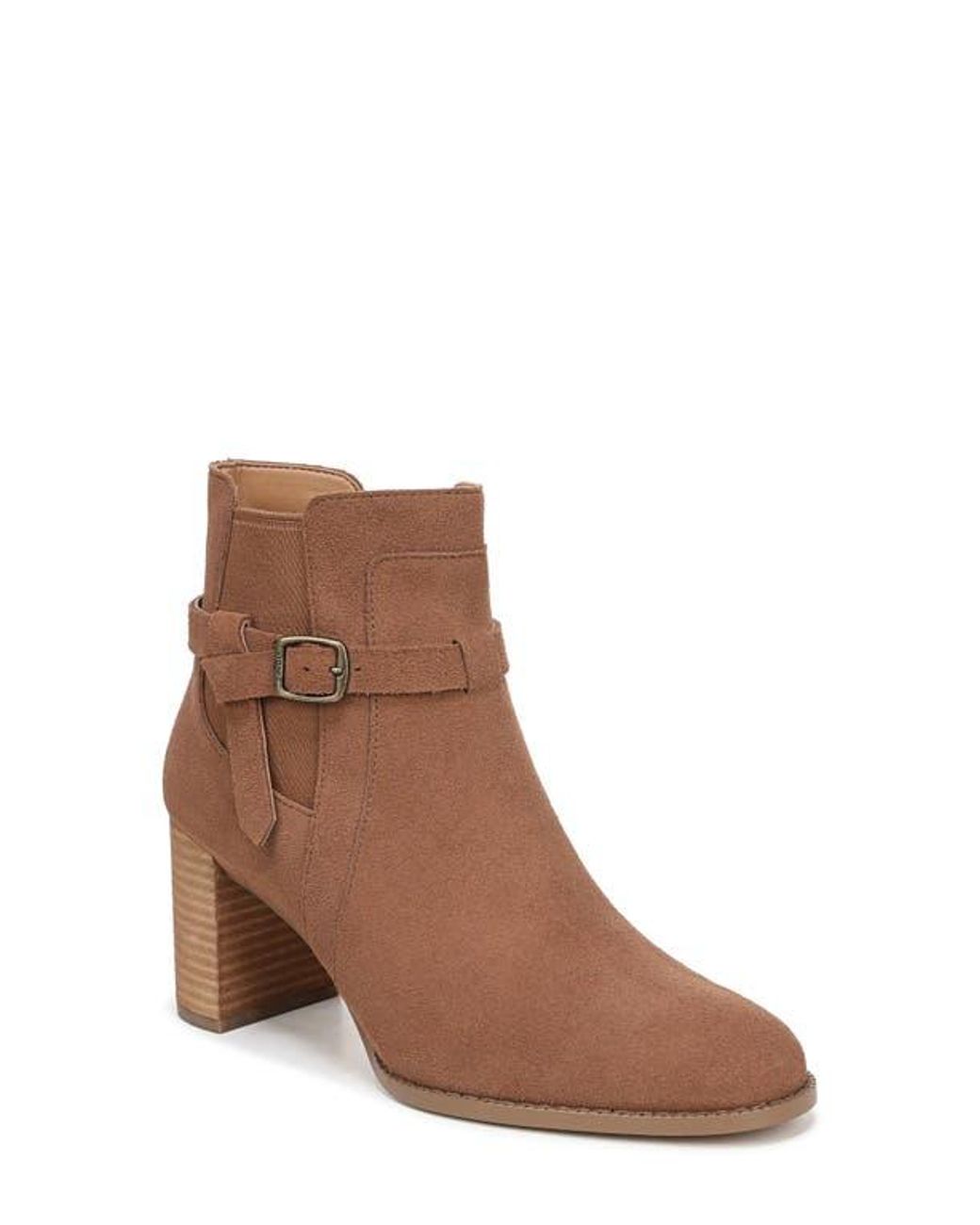 A buckled ankle strap accents the supple suede upper of a versatile bootie featuring Meta Dome technology to reduce forefoot pressure and a built-in VIO MOTION footbed for shock-absorbing cushioning with arch support. 1" heel 4 1/4" shaft Side zip closure with elastic gore inset Removable, cushioned insole with arch support<br> Leather upper/synthetic lining and sole Imported