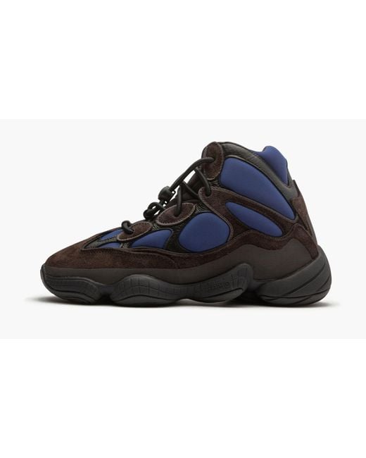 The adidas Yeezy 500 High "Tyrian" is a Spring 2020 colorway that fuses vintage performance basketball aesthetics with hiking boots for a look in and of itself. Only the second colorway of the high-top Yeezy 500 to release, this version features a navy blue neoprene base along the forefoot, mid-panel, and collar. Supple brown suede and black leather overlays on the toe, mid-panel, and collar provide a contrasting appearance that riffs on hiking footwear. Unlike the previously released "Slate" Yeezy 500 High, this colorway introduces an adjustable lace toggle on top the black neoprene tongue. Recalling nostalgic technology from adidas's archives, both the adiPRENE midsole and Feet You Wear outsole introduce a decidedly nostalgic element to this contemporary design. Release date: May 16, 2020.. Leather/Suede/Neoprene/Rubber. Color: black