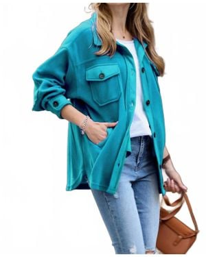 Fleece Button Front Pockets Shacket Jacket - Blue