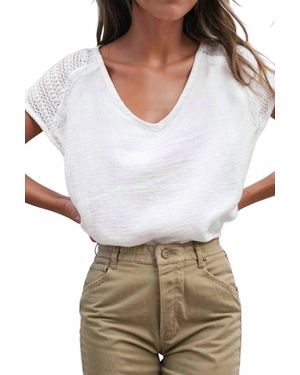 Lace Crochet Textured Button Back V-Neck T Shirt - White