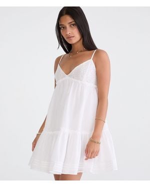 Solid V-Neck Crocheted Babydoll Mini Dress - White
