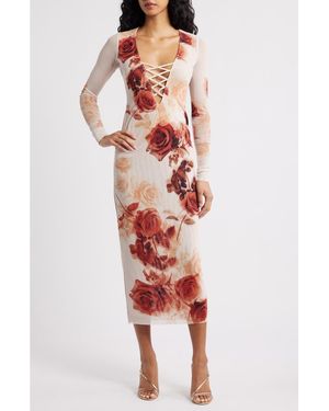 Cambria Print Long Sleeve Mesh Midi Dress - Red