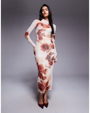 Mesh Roll Neck Long Sleeve Midaxi Dress - Pink