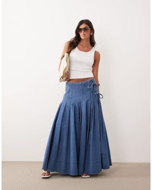 Curve Pleated Denim Midi Skirt With Tie Detail - Blue
