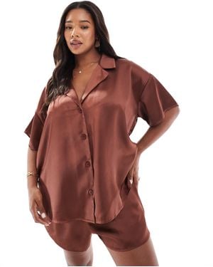 Asos Design Curve Satin Short Sleeve Shirt Co-Ord - Red