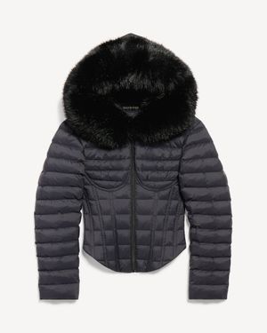 Hooded Corseted Puffer Jacket - Black