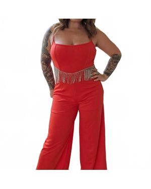 Rhinestone Fringe Cut Out Side Open Back Jumpsuit - Red