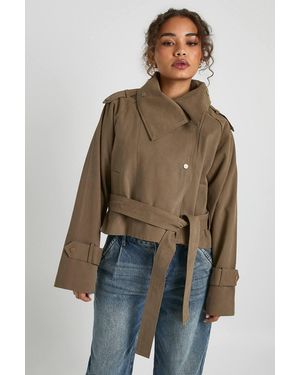 Asymmetric Belted Cropped Trench Jacket - Brown