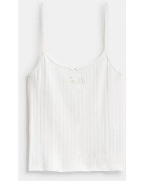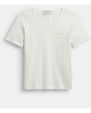 Refined and cool, classic and sophisticated, New York, luxury label Coach has long been synonymous with impeccable taste and city-ready reverie. Dating all the way back to 1941, this time-honored brand boasts a rich heritage of excellent craftsmanship and uncompromising quality. When it comes to cutting a well-groomed, accomplished silhouette, it has to be Coach. Boost your capsule closet with Coach tops. These simple, yet striking, elevated staples will work hard to hint at your effortless, yet polished style.