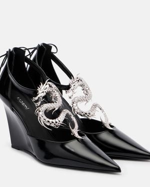 Dragon Embellished Leather Wedge Pumps - Black