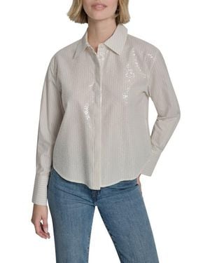 Sequin Pin Stripe Button Front Shirt - Gray