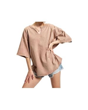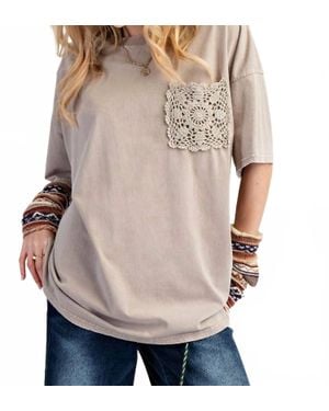 Washed Wing Sleeve Crochet Trim Top - Brown