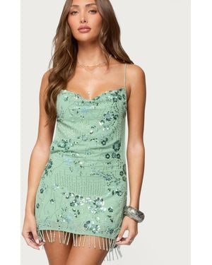 Embellished Fringed Backless Mini Dress - Green