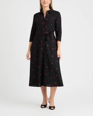Linen Belted Shirt Dress With Embroidery Detail - Black