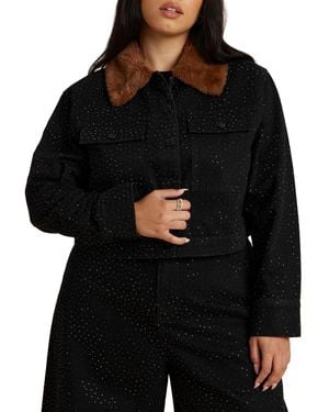 Embellished Denim Jacket With Fur Collar - Black