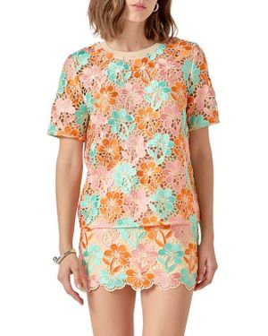 Floral Embroidered Open Knit Top - Orange