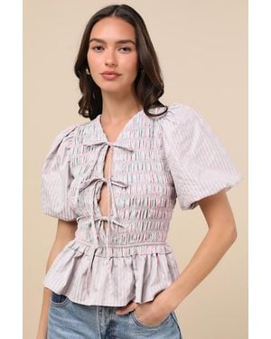Nevaeh Striped Tie-Front Puff Sleeve Peplum Top - Natural