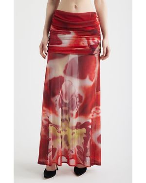 Susurro Print Ruched Mesh Maxi Skirt - Red
