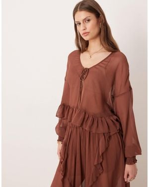 Boho Crinkle Style Tie Front Blouse - Brown