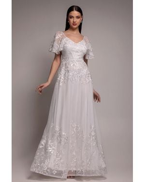 Lace Flutter Sleeve Embroidered Mesh A Line Maxi Dress - Natural