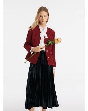 Wool Blend Tweed Sequins Fringe Trim Jacket - Red