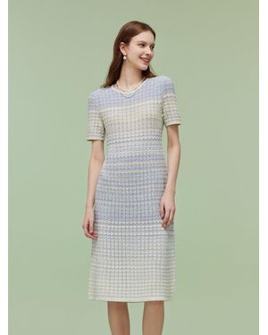 Knitted Puff Sleeve Patchwork Midi Dress - White