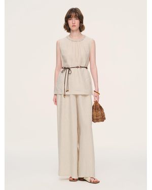 100% Linen Braided Neck Tank Top And Pants Two-Piece Set With Beaded Belt - Natural