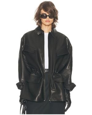The Oversized Leather Bomber With Faux Fur Collar - Black