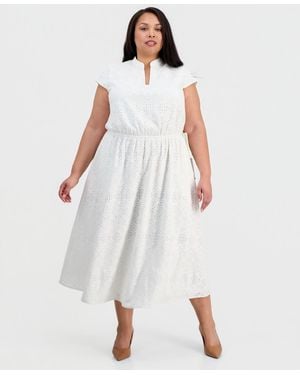 Plus Size V-neck Cap-sleeve Eyelet Dress - White