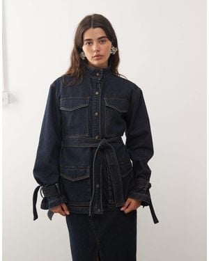 Sweetness High Neck Belted Cinch Waist Tie Sleeve Longline Denim Jacket - Blue