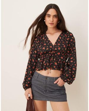 Tie Front Rose Print Blouse - Brown
