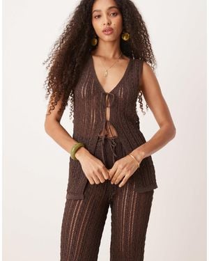 Crochet Tie Front Sleeveless Top Co-ord - Brown