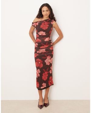 Asymmetrical Neckline Floral Midi-dress - Blue