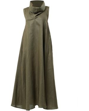 Striped Linen-Cotton Maxi Shirt Dress With Buttons- Khaki Stripes - White