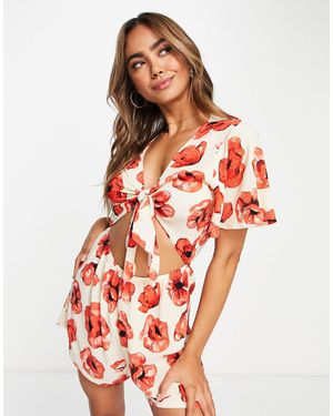 Relaxed Playsuit With Tie Front And Frill Sleeves - Multicolor