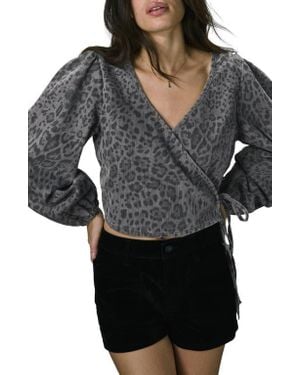 Tree Print Long Sleeve Ruched Detail Blouse - Gray